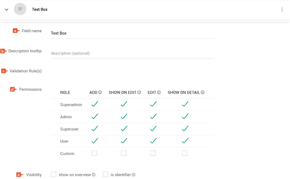 Permissions: Definition der Berechtigungen für dieses Datenfeld. Siehe Permissions.