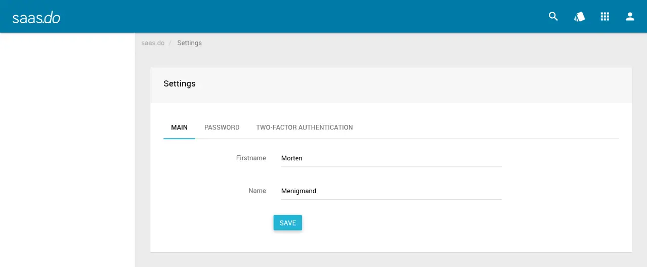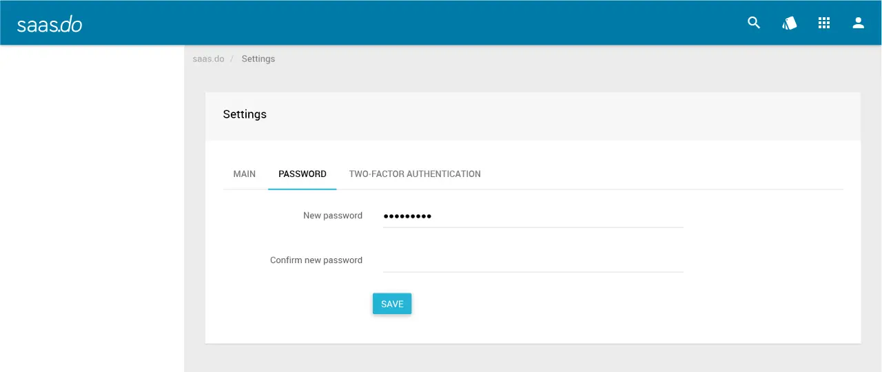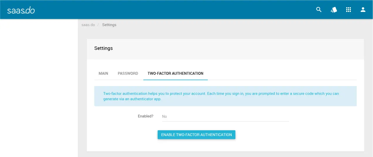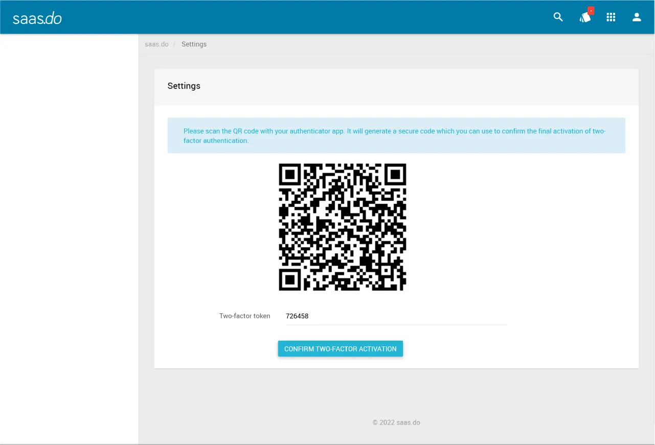 - TWO-FACTOR AUTHENTICATION: Freischalten der Zwei-Faktor-Authentifizierung für deinen Account. Wenn du diese Funktion aktivierst, benötigst du in Zukunft für die Anmeldung an saas.do neben deiner E-Mail-Adresse und deinem Passwort einen Bestätigungscode. Dieser Code wird von einer Authenticator-App auf deinem Smartphone generiert.