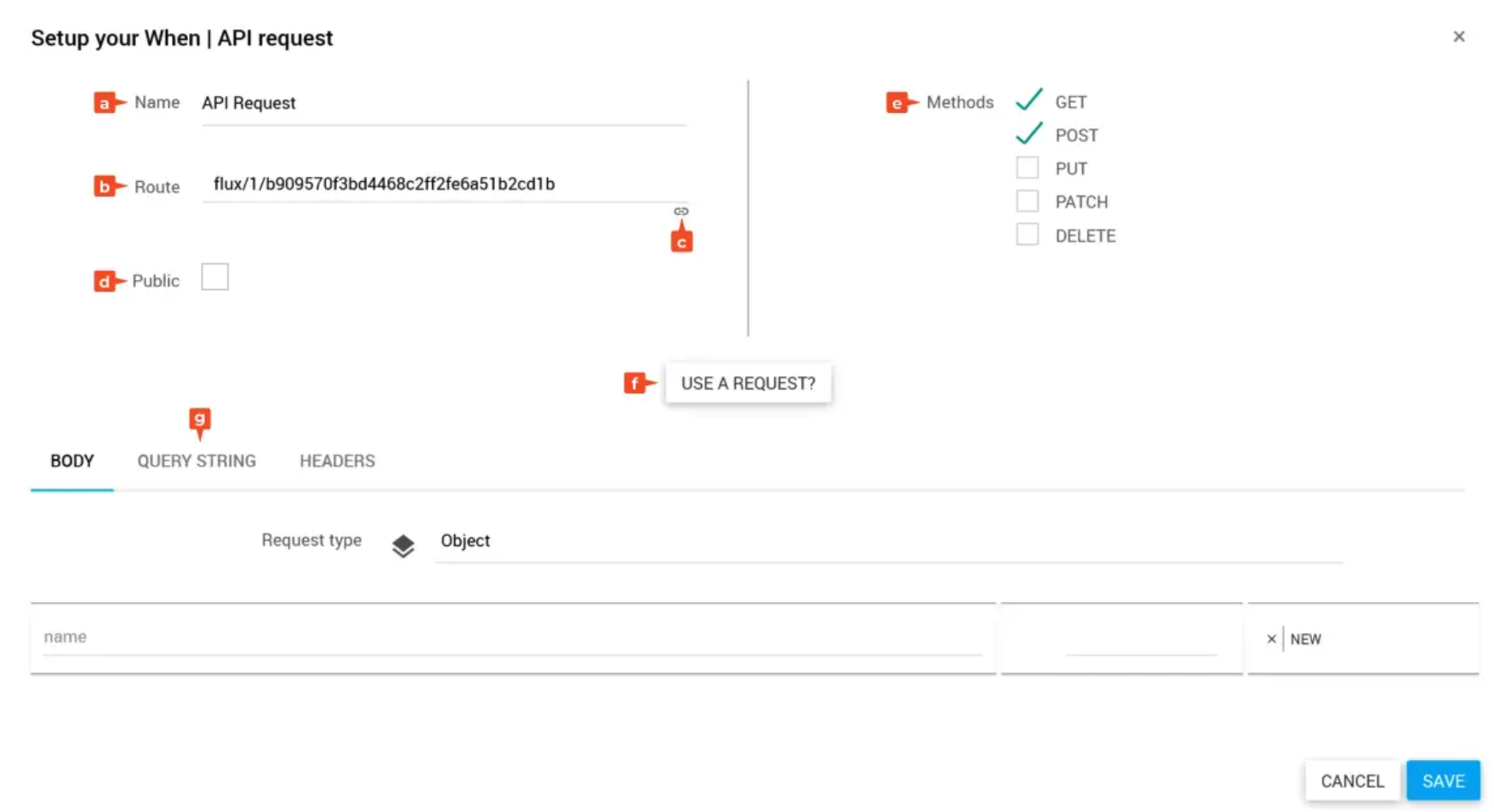 - Automatisiert über den Dialog USE A REQUEST? indem du entweder den temporären URL-Endpunkt triggerst, oder ein JSON-Objekt einfügst.