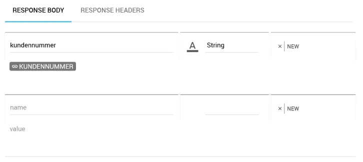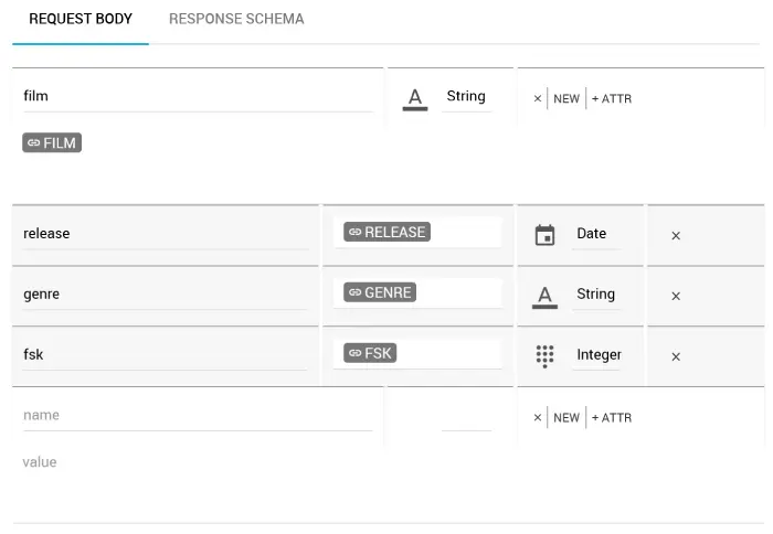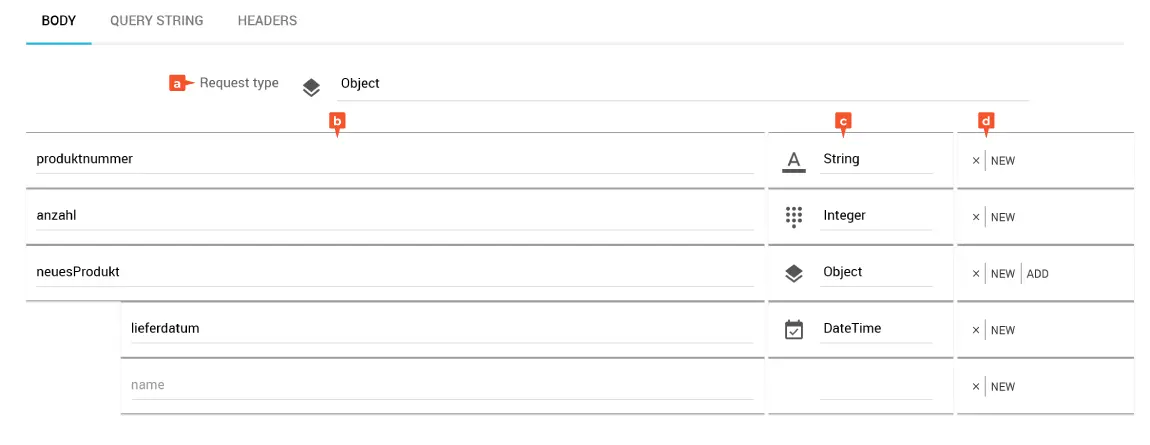 In BODY ist die Maske für das Anlegen der einzelnen Datenfelder nur sichtbar, wenn der Request type ein Object, oder eine Collection of Objects ist.