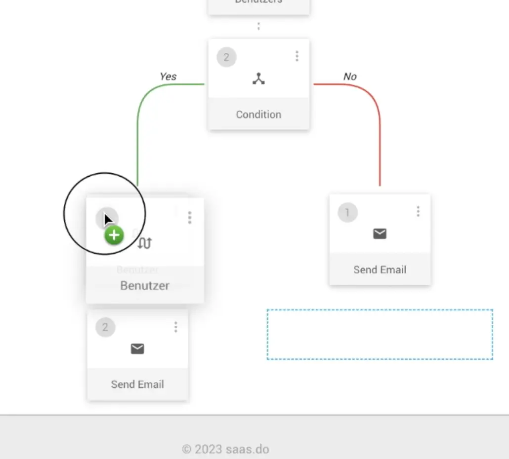 Ziehe den Baustein aus der WHEN- oder DO-Liste in den Arbeitsbereich des Workflow-Baukastens. Die blau markierten Bereiche helfen dir hierbei den Baustein im gewünschten Pfad zu platzieren.